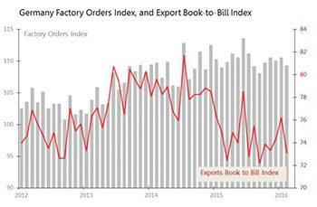 ![]() Japan Consumer Confidence Friday 8th April • Japan March consumer confidence surprises up 1.6pts to 41.7 – Rebounds from Feb’s Shocker – Overall livelihood up 2pts to 40.5 – Confidence in employment up 1.7pts to 43.9 – Willingness to buy durables up 1.7pts to 41.7 – Income growth up 0.8pts to 40.6 Germany industrial production stronger than expected Three key shocks Germany factory orders fall as export orders dry Mostly, it seemed that German industry had a busy February, with industrial production beating consensus expectations by rising 1.3 percent yoy, and exports also beating consensus by rising 1.3 percent mom sa and 4.1 percent yoy with a monthly gain which was 1.4SDs better than historic seasonal trends. But then came the news that February’s factory orders dropped 1.2 percent mom sa and rose only 0.5 percent yoy. This was unexpected. Germany’s domestic demand isn’t slacking, with orders up 0.9 percent mom, but foreign orders dropped 2.7 percent mom, with orders from the Eurozone down 3.7 percent mom, and the rest of the world down 2.1 percent. Foreign orders for Germany’s consumer goods dropped 10.4 percent mom, capital goods fell 3.9 percent mom, but orders for industrial intermediates rose 2.4 percent. As far as Eurozone demand is concern, there were severe falls for consumer goods (down 10.8 percent mom) and capital goods (down seven percent). The weakness lodges a question mark over the immediate prospects for Germany’s industry. First, it depresses Germany’s exports book-to-bill ratio back toward the bottom of the levels endured throughout 2015, snuffing out a promising recovery seen during the previous three months. More, this comes just as the competitive advantage enjoyed throughout 2015 from the weakness of the Euro against the dollar during 2H15 and 2015 begins to reverse. In December the Euro was down 11.8 percent yoy against the dollar; by February it was down only 2.4 percent yoy, and so far in April it is up 5.5 percent yoy. The road gets steeper from here. Second, it begins to look as if the overall trend for Germany’s factory orders is deteriorating from mere stasis seen between mid-2014 and mid-2015 to a mildly falling trend. This, incidentally, is anomalous: data from most of the rest of the world, excluding Japan, looks to have passed the worst of the dollar-inspired gloom of 2015. Maybe upturns achieved outside the Eurozone will be strong enough to resuscitate demand for Germany’s industrial exports. That, at least, is what German industry must now be hoping. |