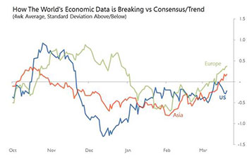 ![]() Although business headlines continue to assert that bad times are just around the corner, an increasing proportion of the world’s economic data is arriving better than expected. In fact, that proportion is now at its highest since the beginning of December. Both Asia and Europe are driving this upturn, whilst the US is still treading the path of mild disappointment, as it has since early December. .Asia: The most positive flow of news during the week was the rise in March’s foreign currency reserves, which was reported almost everywhere, with even China’s reserves rising $10.3nb mom. This return in international confidence helped push the 4wk performance vs consensus to its best since early November. US: This was a light week for economic news, but despite the unexpected strength of trade data, the numbers generally continue to mildly disappoint consensus expectations. Europe: The region’s economic news continues to beat consensus expectations with increasing frequency. However, this week’s gains were heavily influenced by Germany’s recent trade strength, which the fall in factory orders suggests is under threat in the short to medium term. |