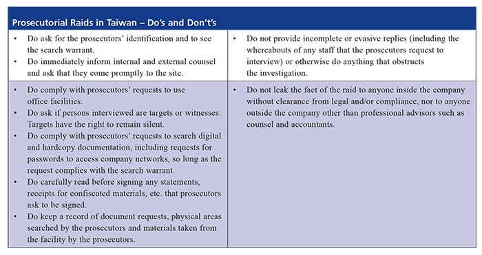 ![]() Post raid In addition to addressing any legal or regulatory violations via changes to relevant internal processes, depending on the severity of the matter, we recommend a post-raid investigation undertaken by external counsel, similar to what occurs in other jurisdictions, that would include interviews of relevant staff, review of correspondence and external counsel’s opinions and recommendations. Although a global law firm may conduct such an investigation and issue a report, unique Taiwan laws and regulations, in addition to language and cultural issues, make local counsel a more desirable option. The FSC may issue financial penalties if the institution fails to comply with its documentation and other requests. Such penalties range from NT$1.8 million (approximately US$55,000) to NT$10 million (approximately US$300,000). Typically the FSC will issue a notice with fines or request for remedial action, but will not provide the target with a detailed report of its findings, as such reports are for internal circulation only. Criminal investigations of financial institutions Raids and investigations in other regulated industries Food and pharmaceutical regulatory agencies at both the central and local government level also periodically raid corporate offices, manufacturing facilities and warehouses as part of product quality investigations. Recently the targets of such raids have tended to be local rather than multinational companies. If raided by public prosecutors, while they are on-site employees should of course request the presence of an internal of external counsel. Employees who are questioned may first ascertain whether they are being questioned as a witness or as the target of a criminal investigation. A lawyer may be present during the questioning of witnesses and targets. A lawyer may also be present to ensure that the prosecutors do not take documentation from the scene that exceeds the scope of the warrant. Taiwan’s criminal procedure code precludes the execution of a search warrant at night, subject to exceptions for urgency or the target’s consent. Where the execution of a search warrant on a financial institution or corporate might impact the stock price of a company involved in the matter, it is common for the prosecutors to execute the search warrant on a Friday afternoon so that there are two non-trading days for the market to digest the news. |
