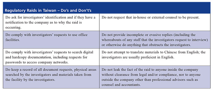 Dawn raid. Two words that cause fear among in-house counsel, compliance officers and senior management, even more so when it occurs in a spoke location that might lack the resources and experience to manage an investigation, and where laws, regulation, business practices and/or language might differ dramatically. Taiwan, as in other Asian jurisdictions, continues to see raid activity by both financial regulators as well as prosecutors and other regulatory agencies. In their overview of investigatory raids in Taiwan, Dr George Lin and Ross Darrell Feingold of Lin & Partners discuss what internal stakeholders need to know in order to be better prepared.