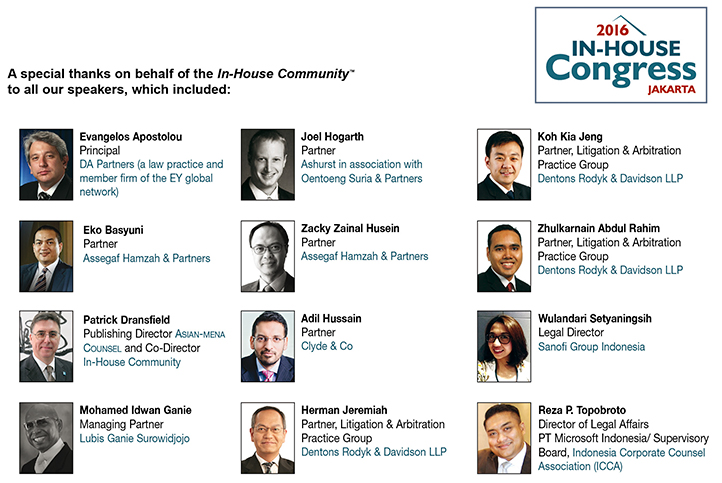 Alongside co-hosts Ashurst; Oentoeng Suria & Partners; Assegaf Hamzah & Partners; Clyde & Co; Dentons Rodyk & Davidson; and Lubis Ganie Surowidjojo, we hosted our twelfth annual In House Congress Jakarta at the JW Marriott Hotel Jakarta on May 11, 2016.