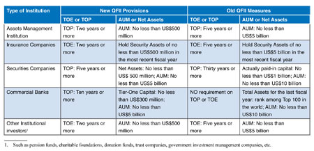 ![]() Relaxing the qualification thresholds The New QFII Provisions shorten the required time of existing (TOE) or time of operation (TOP) of the QFII applicants and significantly lower the amount of securities assets under management of the QFII applicant in the most recent fiscal year (AUM), the net assets or other capital requirements of the QFII applicant. Below is a summary of the differences regarding TOE, TOP and AUM between the New QFII Provisions and the Old QFII Measures: |
