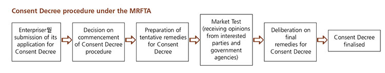Regardless of the name used to refer to it, the common principle of a consent decree is that the suspected enterpriser voluntarily proposes reasonable remedies, such as restoration of status quo and consumer injury relief, etc., and the competition authority closes the case without defining the illegality of the conduct if it finds the proposed remedies reasonable after undergoing the market test. In Korea, while the Korea Fair Trade Commission (KFTC) pursued the introduction of the consent decree system from 2005, it was introduced in 2011 under the Monopoly Regulation and Fair Trade Act (MRFTA) as a follow-up action to the Korea-US Free Trade Agreement, and also later applied to the Fair Labeling and Advertising Act in December 2013.