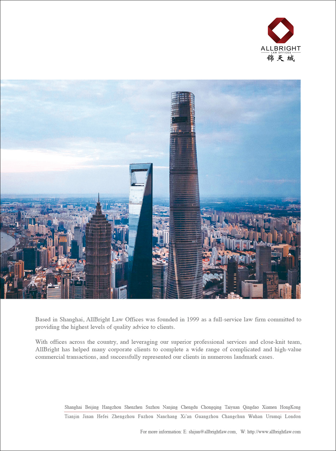 Based in Shanghai, AllBright has grown, innovated and provided unmatched service throughout a period of continuous economic and political change across China. Our focus on providing excellent advice and support to our clients has led to rapid expansion and we have established branch offices in 21 cities on the Chinese mainland (Hangzhou, Beijing, Shenzhen, Suzhou, Nanjing, Chengdu, Chongqing, Taiyuan, Qingdao, Tianjin, Xiamen, Jinan, Hefei, Zhengzhou, Fuzhou, Nanchang, Xi’an, Guangzhou, Changchun, Wuhan and Urumqi) as well as in Hong Kong, London (UK) and Seattle (USA). In addition, as a result of our increased international presence we have also established an association with the Hong Kong law firm Stevenson, Wong & Co. and a strategic partnership with the Bird & Bird LLP.