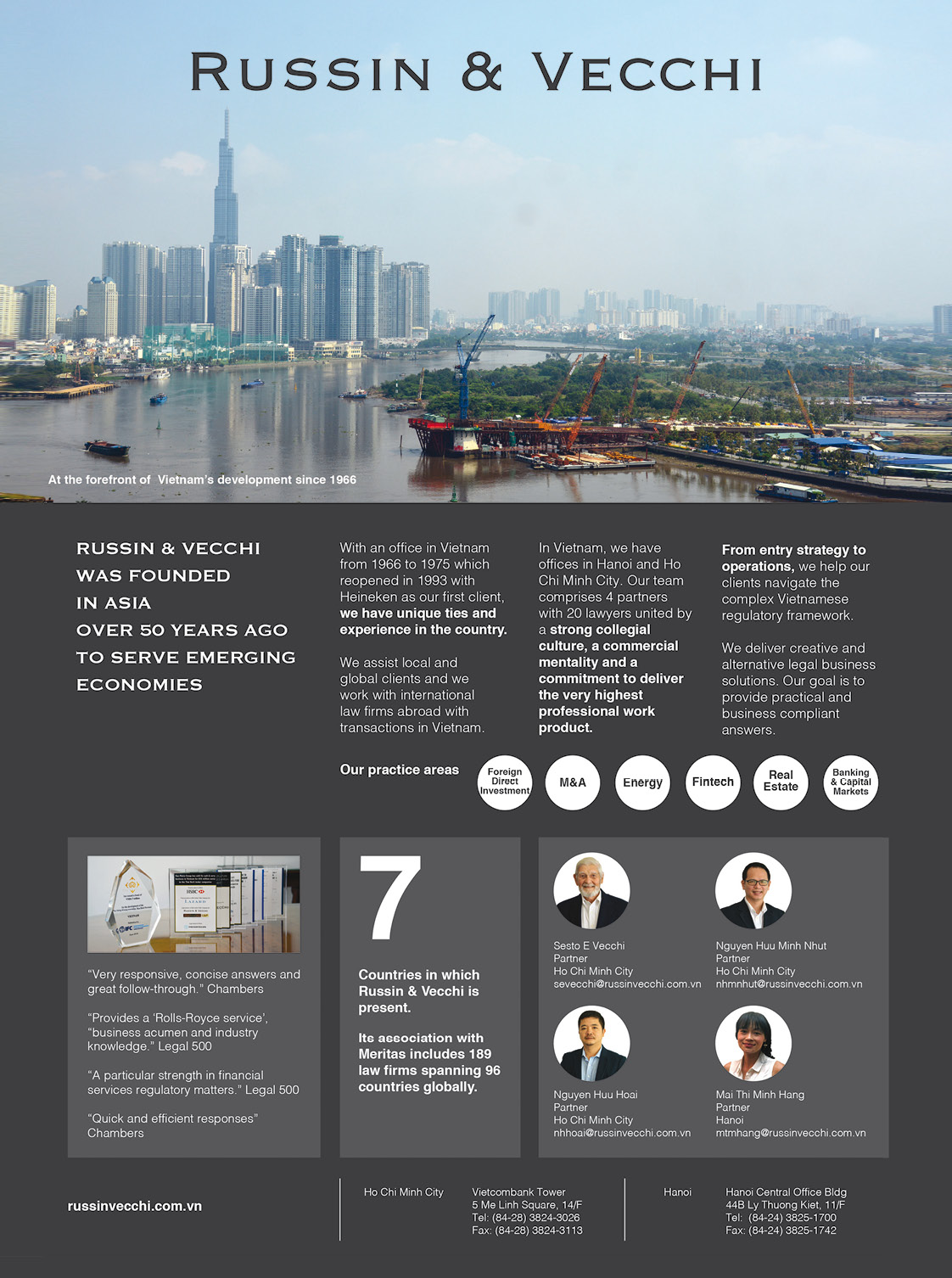 Russin & Vecchi’s Vietnam practice serves both Vietnamese and foreign clients investing, financing, and providing services in Vietnam. We advise clients on alternative structures available to operate in Vietnam; we assist them to set up; and, more importantly, we advise on ongoing legal issues which arise as a result of operating within the country. In addition to its corporate practice, Russin & Vecchi has an active M&A, banking and finance, capital markets, real estate, infrastructure, tax, employment law, intellectual property and other practice areas. In Asia, Russin & Vecchi also has offices in Thailand and Taiwan.