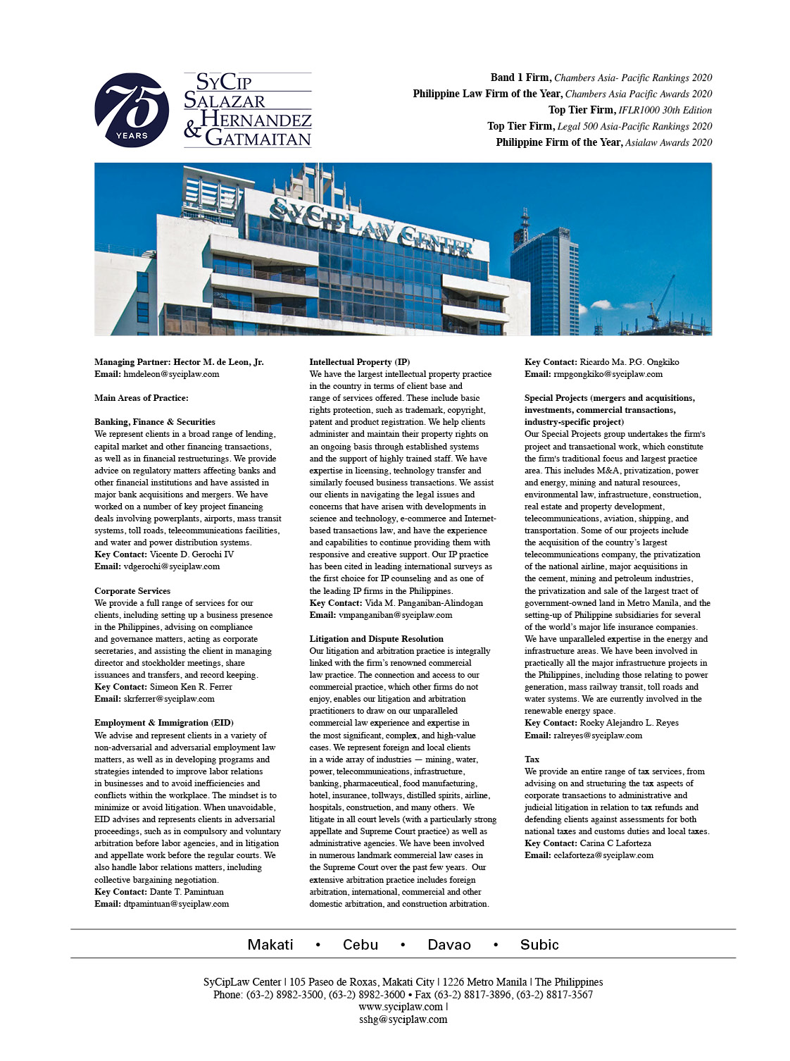 SyCip Salazar Hernandez & Gatmaitan was founded in 1945 and is a leading full-service law firm in the Philippines. Our principal office is in Makati City, with branch offices in Cebu City, Davao City and the Subic Bay Freeport Zone. We offer a broad and integrated range of legal services, with departments in the following fields: banking, finance and securities; special projects; corporate services; litigation and dispute resolution; employment law and immigration; intellectual property; and tax.