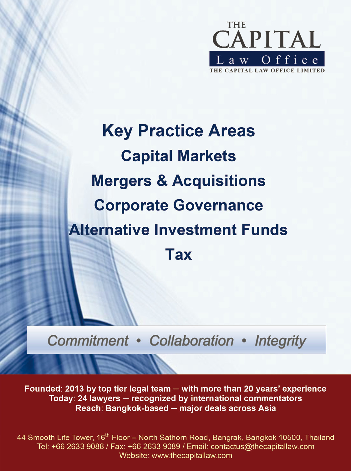 The Capital Law Office is an independent law firm founded in 2013 by a legal team with more than 20 years’ experience. Today, 24 lawyers, including 4 award-winning partners, advise local and international clients on transactions in Thailand and across Asia, with in-depth understanding of clients’ business needs and objectives. The firm provides a full range of legal services, focus on Capital Markets, Corporate and M&A, and Corporate Governance.