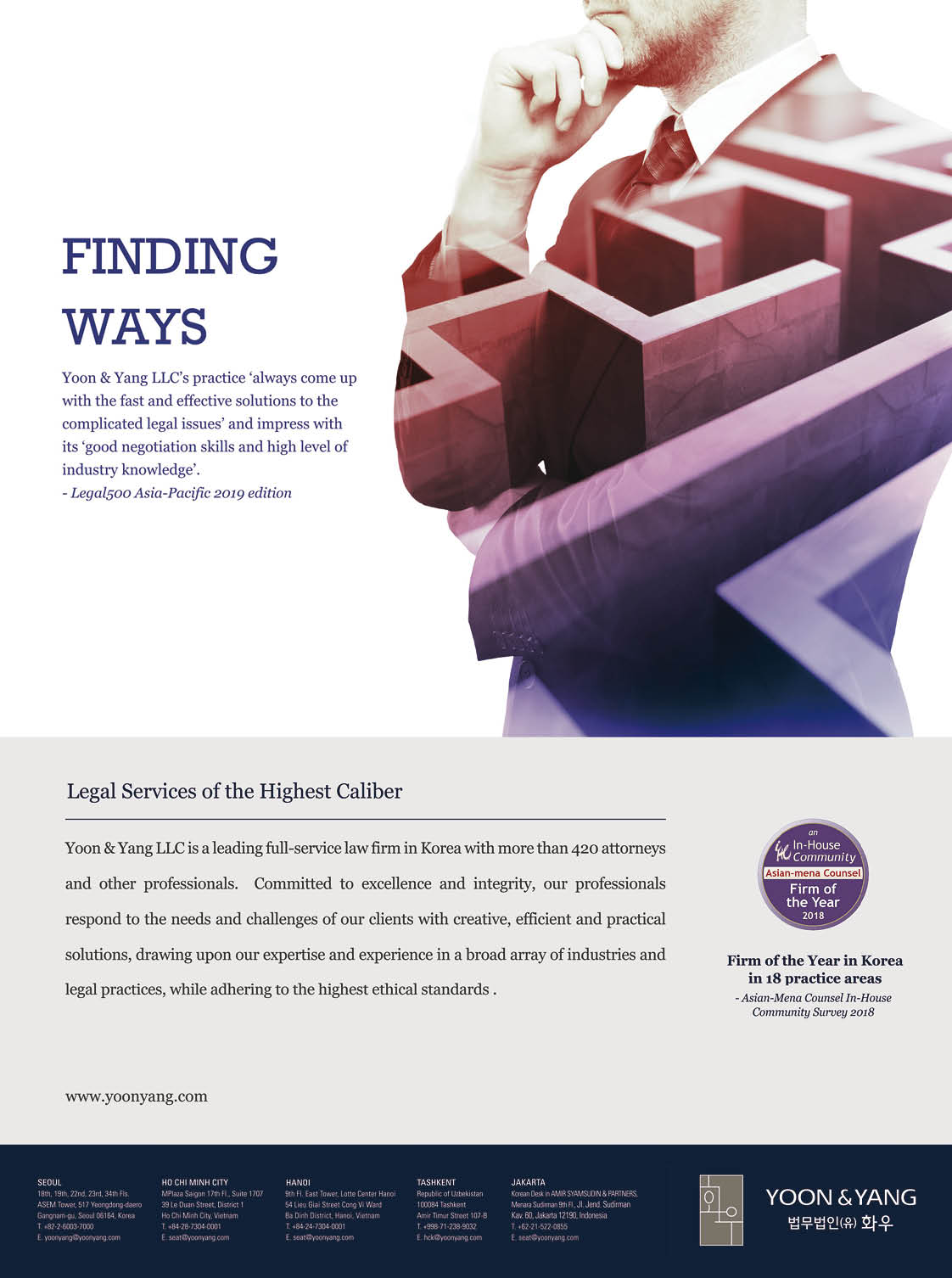 Yoon & Yang LLC is one of Korea’s premier full-service law firms with more than 420 attorneys and other professionals. Established in 1989, Yoon & Yang has built a solid reputation for providing the highest quality legal service while adhering to the highest ethical standards. Yoon & Yang has provided sophisticated advice to major domestic and international corporations as well as government entities. Committed to excellence and integrity, Yoon & Yang’s professionals are entrusted to handle the needs and challenges of the clients with creative and practical solutions, drawing upon our expertise and experience in a broad array of industries and legal practices.